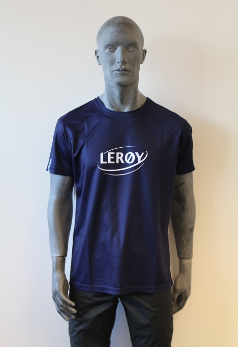 Mørkblå, hvit og lyseblå rygg Noe smal modell – velg et nr opp for løsere passform Pustende og litt elastisk stoff. På ryggen er det mesh og lycra (tynn midtstolpe) Korte ermer U-hals