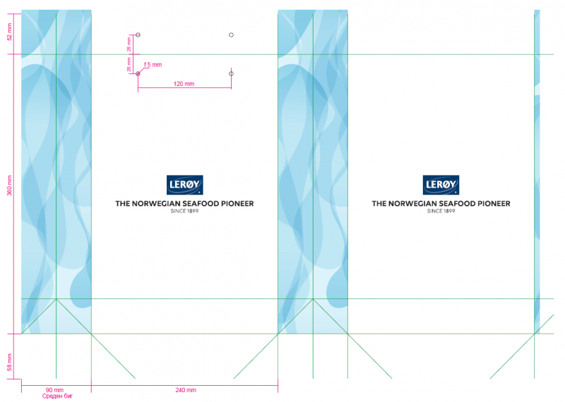 Lerøy logo foran og bak, og design med blåfarger på sidene.