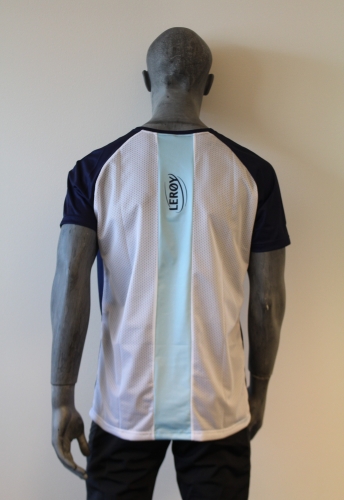 Mørkblå, hvit og lyseblå rygg Noe smal modell – velg et nr opp for løsere passform Pustende og litt elastisk stoff. På ryggen er det mesh og lycra (tynn midtstolpe) Korte ermer U-hals