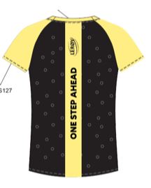 Gul for god synlighet i uoversiktelig stafettsituajon Noe smal modell – velg et nr opp for løsere passform Pustende og litt elastisk stoff. På ryggen er det mesh og lycra (tynn midtstolpe)