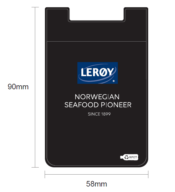 Kort holder i 58x90x2mm med 3M lim. Produsert av resirkulert polyester. Farge sort med fullfarget Lerøy logo.